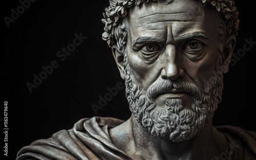 A close-up portrait of an ancient Roman merchant with a beard and serious expression, wearing a laurel wreath and a tunic.