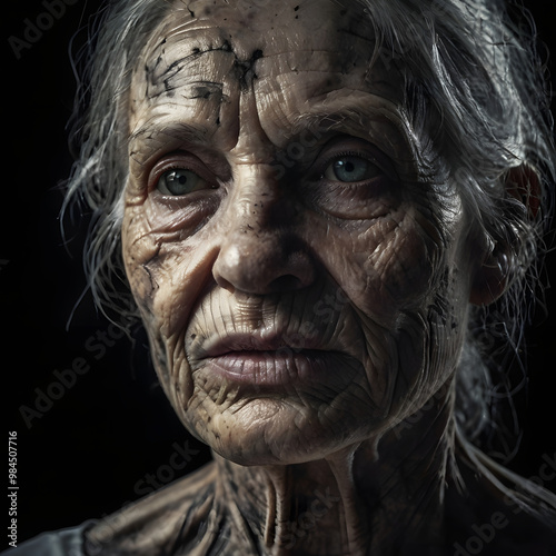 haunted, elderly, woman, face, wrinkle, dark, eye, piercing, closeup, portrait, mysterious, skittish, scarey, creepy, gothic, vintage, antique, old, aged, senior, grandmother, mother, weathered, worn, lined, etched, deep, hollow, sunken, intense, penetrating, staring, gazing, expression, emotion, feeling, grieved, sorrowful, grief, despair, loneliness, isolation, melancholy, sombre, gloomy, shadowy
