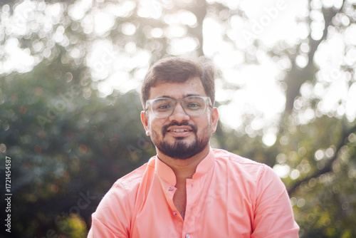 A close-up portrait of an Indian man wearing a traditional kurta. Represents Indian culture, heritage, ethnic fashion, and traditional clothing style