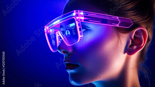 A close-up profile of a young woman wearing high-tech, transparent augmented reality glasses