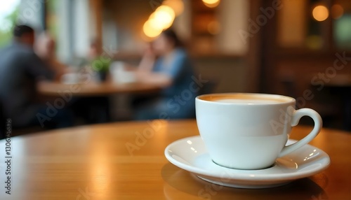 A close-up shot captures a white ceramic cup filled with coffee, resting on a matching saucer atop a wooden table