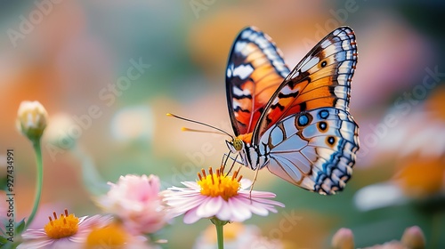 A close-up shot capturing the intricate details of a vibrant, colorful butterfly delicately perched on a wildflower in full bloom