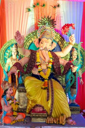 A Closeup shot Ganpati Installed in a Pandal during the 10 Day Ganesh Festival, the idols are immersed in heavy water bodies after the 10 days.