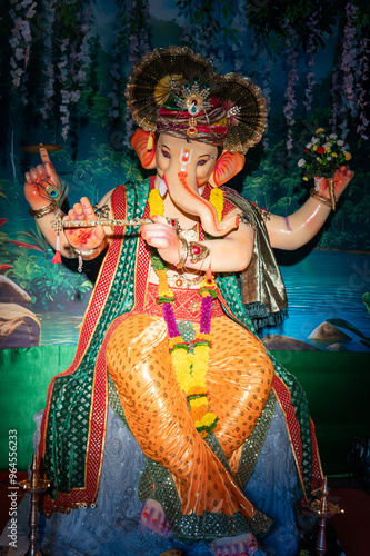 A Closeup shot Ganpati Installed in a Pandal during the 10 Day Ganesh Festival, the idols are immersed in heavy water bodies after the 10 days.