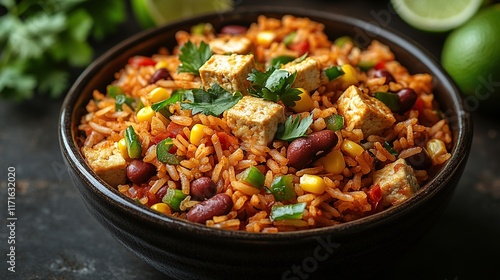 food, dish, meal, cookery, rice, tofu, bean, corn, pepper, vegetarian, vegan, healthy, delicious, tasty, fresh, colourful, vibrant, appetising, dinner, lunch, bowl, plate, ingredient, cooking, receipe, eat, spicey, mexican, legume, vegetable, protein, carbohydrate, favor, aroma, texture, garnish, cilantro, lime
