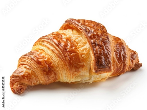 A close-up shot of a flaky croissant on a clean white surface