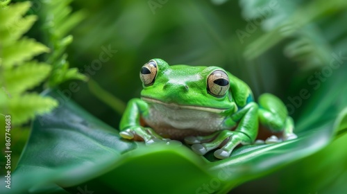 A close-up shot of a green frog with bulbous eyes sitting on a large leaf surrounded by lush greenery, capturing the vibrant colors and textures of the jungle environment.