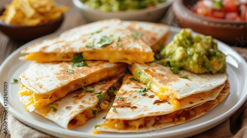A close-up shot of a plate of quesadillas, oozing with cheese and accompanied by guacamole and salsa, on a wooden table, emphasizing the textures and appeal of comfort food.