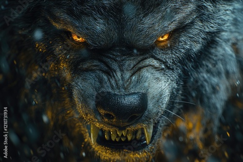 A close-up shot of a wolf's face with glowing eyes, great for depicting fear or wild nature