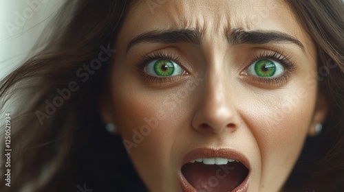 A close-up shot of a woman with fear in her eyes, her wide-open expression and vibrant green irises capturing an intense moment of distress and human vulnerability.