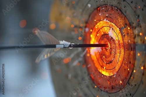 archery, arrow, target, bullseye, range, sport, competition, practice, closeup, shot, hit, aim, accuracy, skill, sharpened, concentration, equipment, recreation, hobby, exercise, health, fitness, bow, shaft, point, nock, string, release, draw, shooting