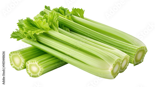 A close-up shot of fresh celery stalks, showcasing their vibrant green color and crisp texture, with the leaves still attached.