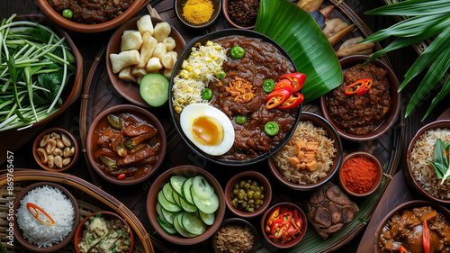 A close-up shot of nasi gudeg, showcasing its rich, brown sauce and diverse textures, with vibrant side dishes arranged around it