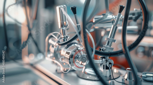 A close-up shot of shiny, intricate medical equipment in a laboratory setting, emphasizing the details and complexity of the instruments.