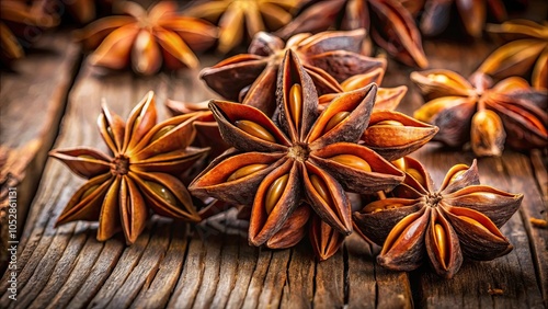 A close-up shot of star anise spice on a rustic wooden background, spice, flavor, cooking, ingredient, aromatic, natural