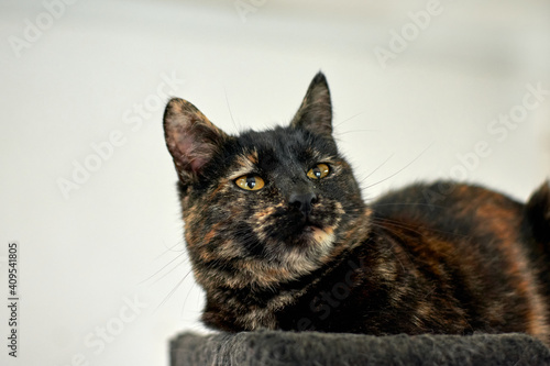 cat, whisker, furry, pet, purebred, felino, companion, indoor, pedigree, paw, mammal, room, purr, looking, pretty, portrait, comfortable, interior, young, cute, adorable, fluffy, closeup, animal hair, animal themes, beautiful, lovely, tortoiseshell, up, white, background, look, black, animal, domestic, fur, kitten, nature, felino, cat, breed, horizontal