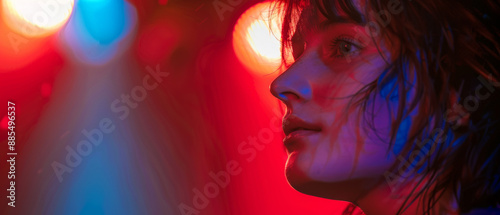 A close-up, side-profile portrait of a young woman bathed in blue and red stage lighting, giving an artistic, ethereal feel.
