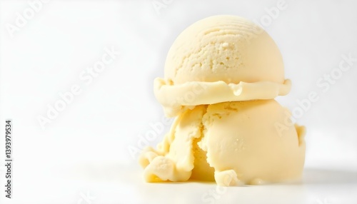 A close-up studio shot of two scoops of vanilla ice cream, one on top of the other, against a white background