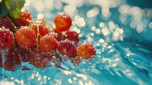 A close-up view of a bunch of berries on a vibrant blue surface. This image can be used to add a pop of color and freshness to any design or project