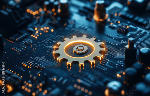 A close-up view of a circuit board features a glowing gear symbol at its center, representing advanced technology and engineering. The intricate details highlight modern electronic components.