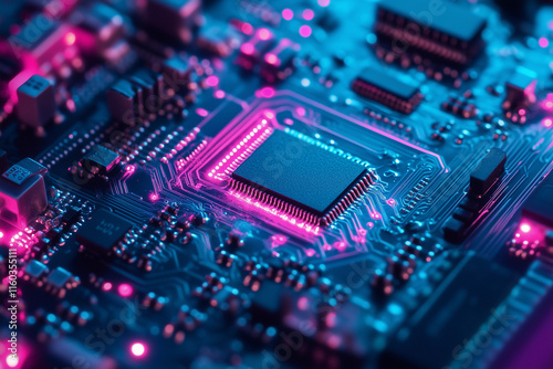 A close-up view of a colorful circuit board showcasing integrated circuits and electronic components illuminated in vibrant blue and pink hues.