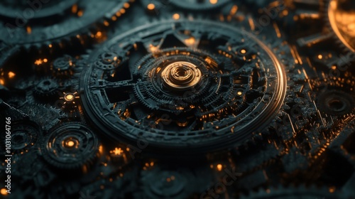 A close-up view of a complex, intricate gear system, with glowing lights illuminating the intricate details.