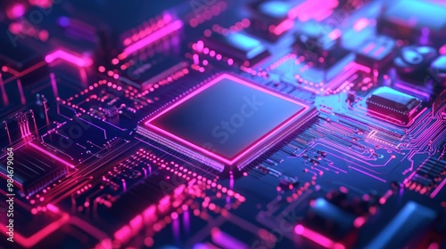 A close-up view of a futuristic circuit board with vibrant pink and blue lighting.