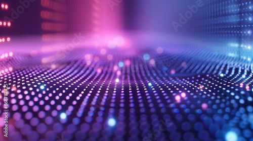 a close-up view of a grid of illuminated dots extending towards the horizon on a surface, with a purple and blue color gradient