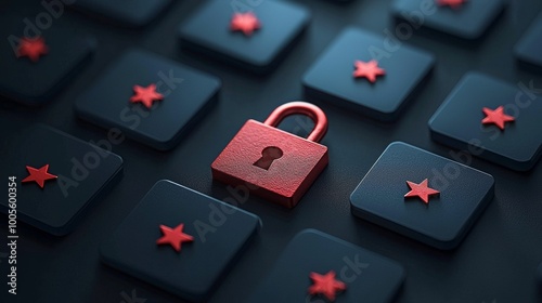 A close-up view of a red padlock on dark keys, creating a digital security theme with star symbols in the background.