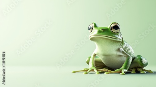 A Close-Up View of a Vibrant Green Tree Frog Sitting on a Pale Green Background, a Captivating 3D Render