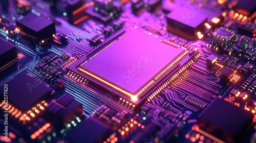A close-up view of a vibrant microchip on a circuit board, showcasing technology and design.
