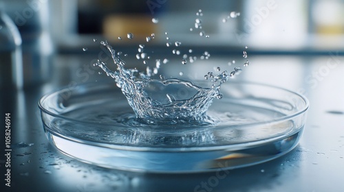 A close-up view of a water drop creating a crown-shaped splash in a petri dish.