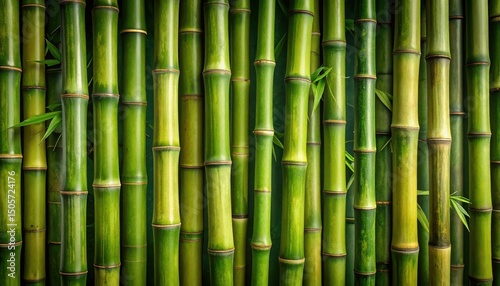 A close-up view of green bamboo stalks arranged vertically, highlighting their natural texture and vibrant color.