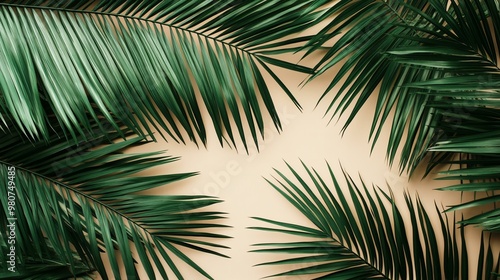 A close-up view of lush green palm leaves against a soft beige background, perfect for tropical themes and nature designs.