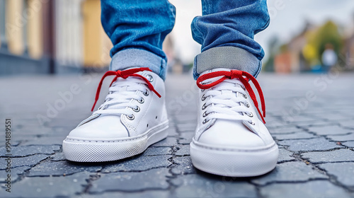 A close-up view of someone's feet wearing trendy white sneakers with red laces, standing on a textured pavement, showcasing casual urban style.