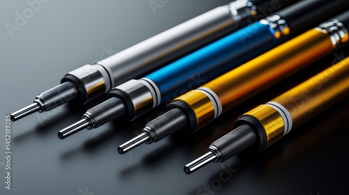 A close-up view of stylish pens on a dark surface, showcasing design and color.