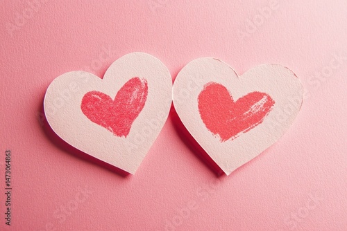 A close-up view of two heart-shaped sticky notes with hand-painted red hearts. positioned next to a lipstick tube. set against a soft pink background. ideal for romantic or beauty-themed projects