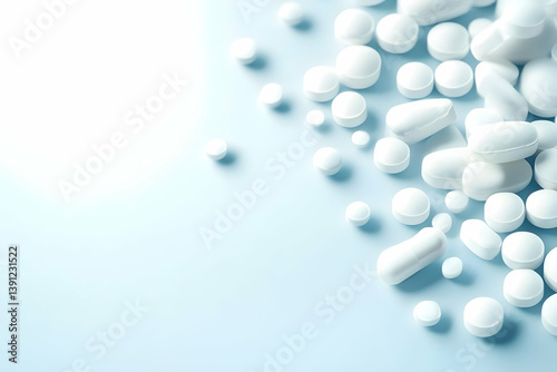 A close-up view of various white pills scattered on a light blue background, representing pharmaceuticals and healthcare.