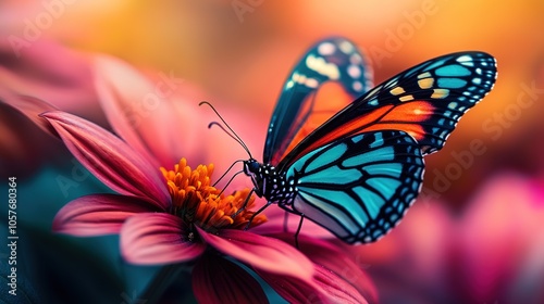 A close-up wildlife photograph of a butterfly resting on a vibrant flower, with intricate wing details clearly visible.