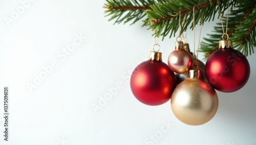 A cluster of colorful Christmas balls hanging from a wooden branch against a white background , , winter wonderland