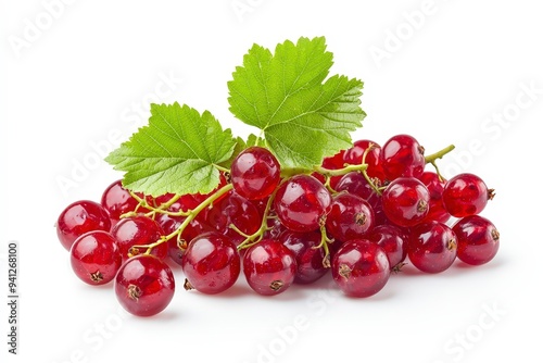 A cluster of fresh red currants with green leaves on a white background.