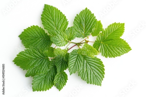 A cluster of green leaves on a clean white surface