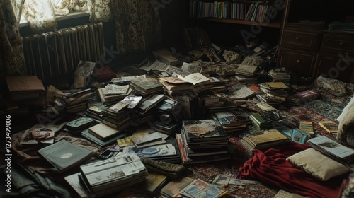 A cluttered room filled with piles of books and scattered papers, showcasing a forgotten space with vintage decor and dim lighting
