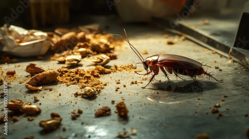 A cockroach walking along a dirty floor, surrounded by crumbs and other food waste.