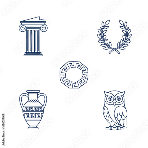 A collection of ancient Greek symbols in a blue line art style including a column wreath owl and amphora.