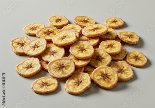 A collection of appetizing banana chips are presented on a simple light gray backdrop.