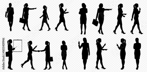 silhouette, woman, woman, business, businesswoman, professional, corporate, office, work, men at work, job, career, employee, executive, manager, staff, colleague, person, people, human, figure, body, pose, posing, action, activity, set, collection, group, illustration, vector, graphic, design, element, icon, symbol, shape, form, outline, profile, shadow, black, isolated, white, background, transparent, art, clip art, pictogram