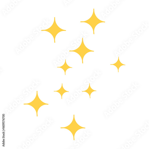 A collection of bright yellow four-pointed star icons representing sparkles and a magical twinkling effect on a white background.