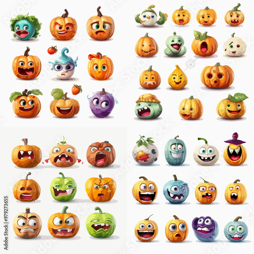 A collection of cartoon faces with different expressions, including happy, sad, and angry. The faces are all made of pumpkins and are arranged in a grid