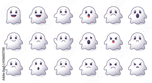 A collection of cartoon ghosts with various facial expressions, displayed in a grid.